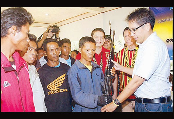 Interior and Local Government Secretary Mar Roxas receives firearms from former NPA rebels during a turnover ceremony in Malaybalay City Sunday.