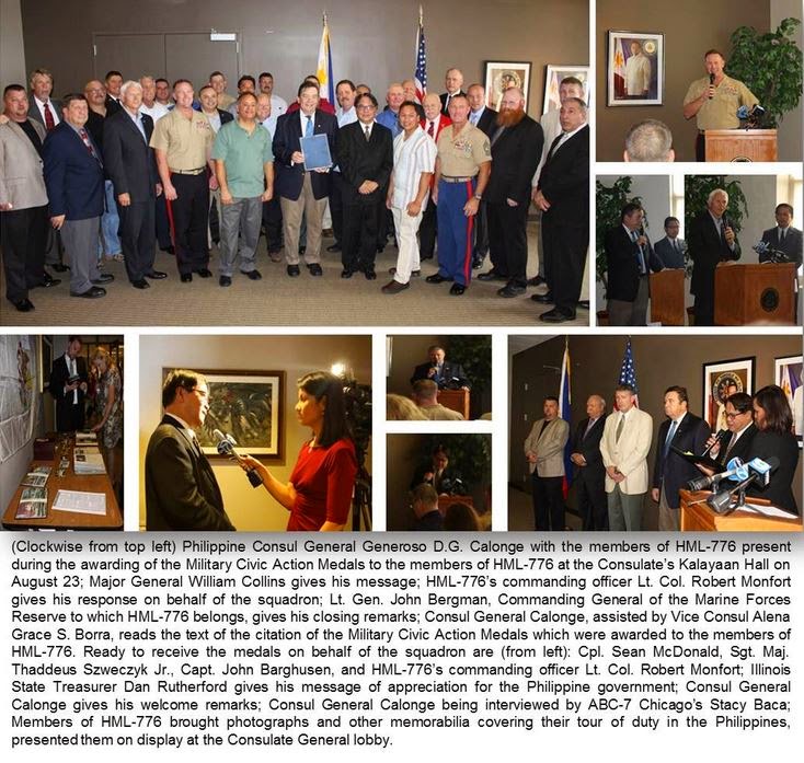 Chicago, (DWDD) —The Philippine Consulate General in Chicago held the awarding of Military Civic Action Medals to members of the Marine Light Helicopter Squadron, United States Marine Reserve (HML-776) on August 23 at the Kalayaan Hall.
